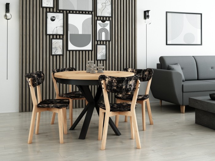 Stylowy i funkcjonalny zestaw mebli do jadalni składający się z okrągłego stołu Orion z laminowanym blatem oraz czterech solidnych krzeseł Lysa 2 wykonanych z naturalnego drewna bukowego. To idealne połączenie nowoczesnego designu z klasyczną elegancją i trwałością, które sprawdzi się w jadalni, kuchni, a także w stylowych wnętrzach restauracyjnych.